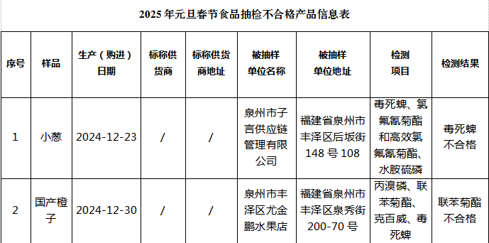 此次食物专项监视抽检以“两节”期间节日热销食物,如畜禽肉及副产物、蔬菜、生果、水产物、糖果、糕点、速冻调制食物等为沉点品种,针对沉点产物的食物添加剂及农药、兽药残留等平安项目进行抽样查验,组织开展监视抽检153批次,检出及格样品151批次,及格率高达98。7%。2批次不及格产物均为农药跨越最大残留限量,别离为1批次葱、1批次橙。市场监管部分已通过官网、微信号等平台向社会发布抽检成果,并组织对不及格食物发卖者进行查询拜访措置。
